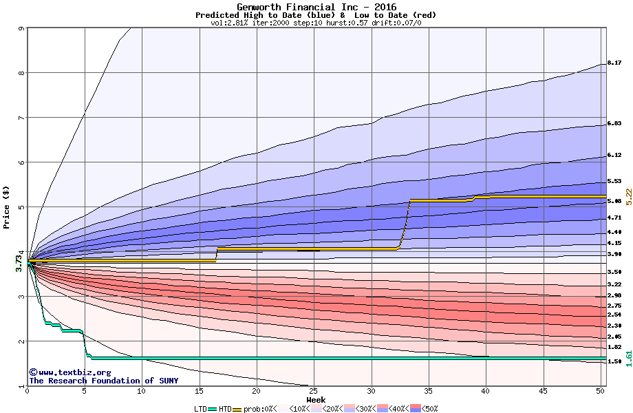 The high to date and low to date prices of the stock plotted against a random walk model for 2016 (what's this?).