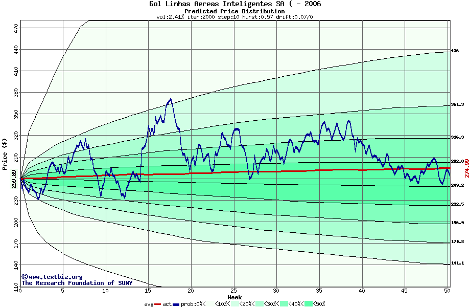 The following graph plots the year-to-date performance of the stock for 2006 compared to the probability calculated by a random walk model.