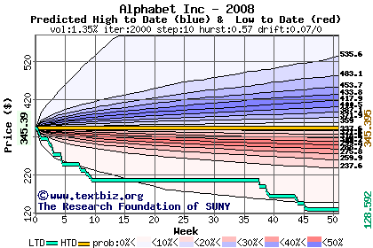 The high to date and low to date prices of the stock plotted against a random walk model for 2008 (what's this?).