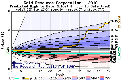 The high to date and low to date prices of the stock plotted against a random walk model for 2010 (what's this?).