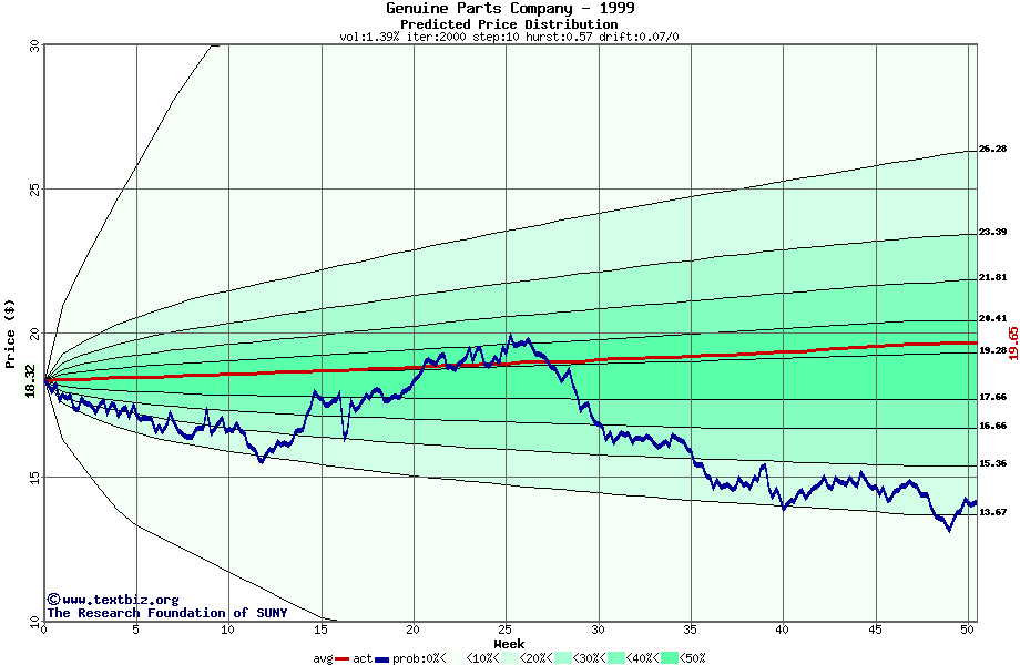 The following graph plots the year-to-date performance of the stock for 1999 compared to the probability calculated by a random walk model.