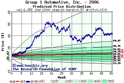 The high to date and low to date prices of the stock plotted against a random walk model for 2006 (what's this?).