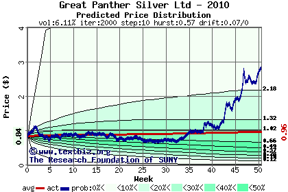 The high to date and low to date prices of the stock plotted against a random walk model for 2010 (what's this?).