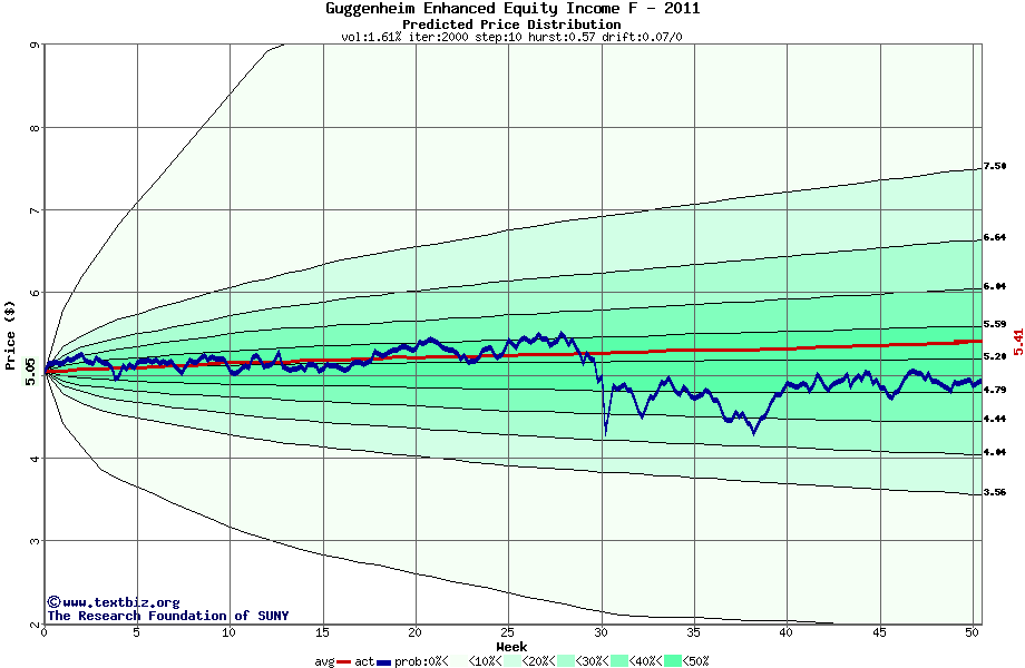 The high to date and low to date prices of the stock plotted against a random walk model for 2011 (what's this?).