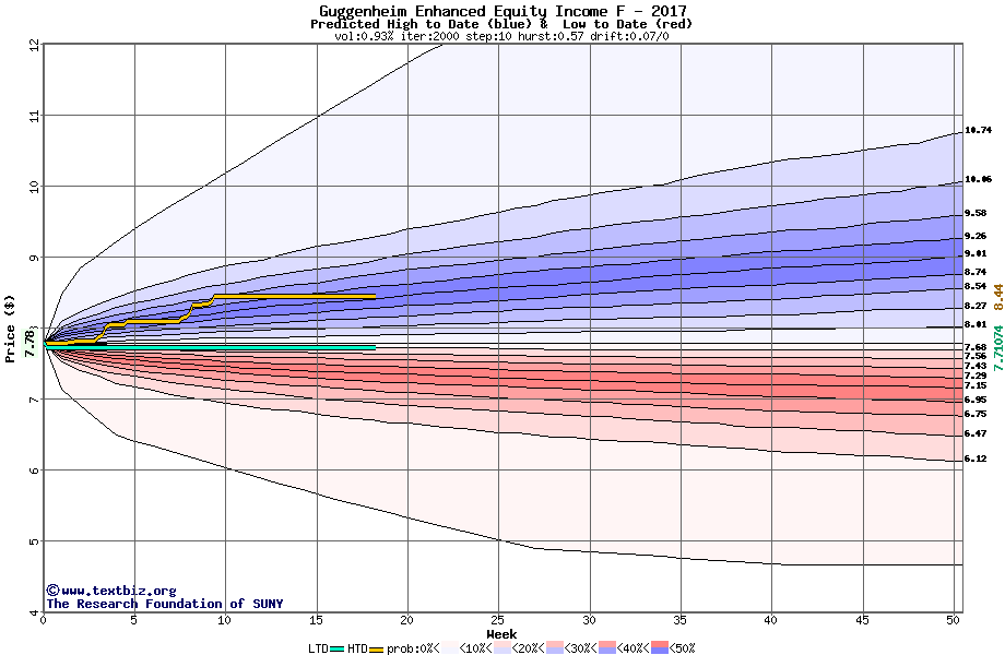 The high to date and low to date prices of the stock plotted against a random walk model for 2017 (what's this?).