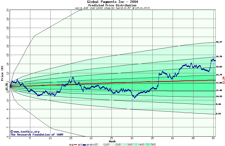 The following graph plots the year-to-date performance of the stock for 2004 compared to the probability calculated by a random walk model.