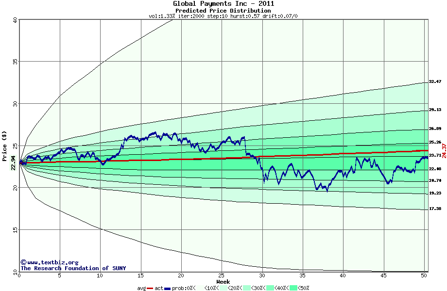The high to date and low to date prices of the stock plotted against a random walk model for 2011 (what's this?).