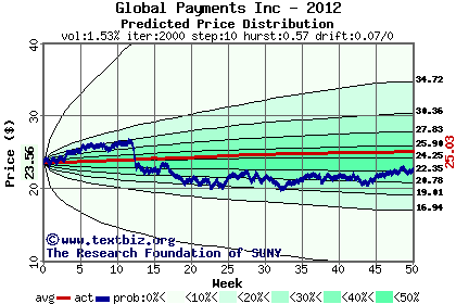 The high to date and low to date prices of the stock plotted against a random walk model for 2012 (what's this?).