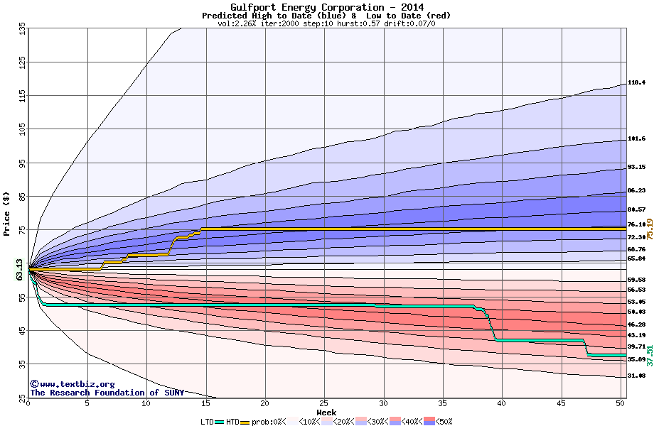 The high to date and low to date prices of the stock plotted against a random walk model for 2014 (what's this?).