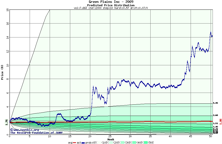 The following graph plots the year-to-date performance of the stock for 2009 compared to the probability calculated by a random walk model.