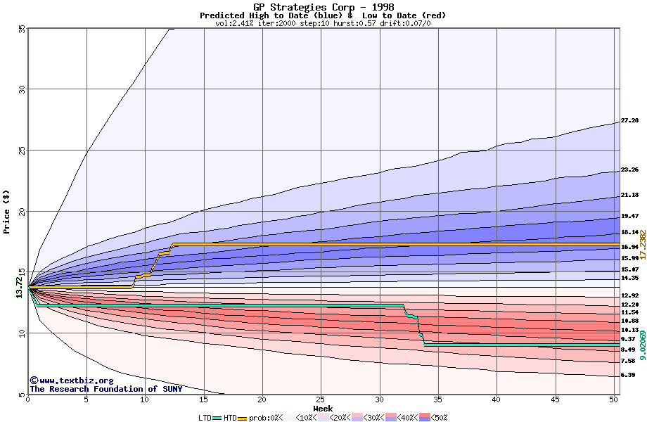 The high to date and low to date prices of the stock plotted against a random walk model for 1998 (what's this?).
