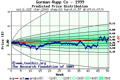 The high to date and low to date prices of the stock plotted against a random walk model for 1999 (what's this?).
