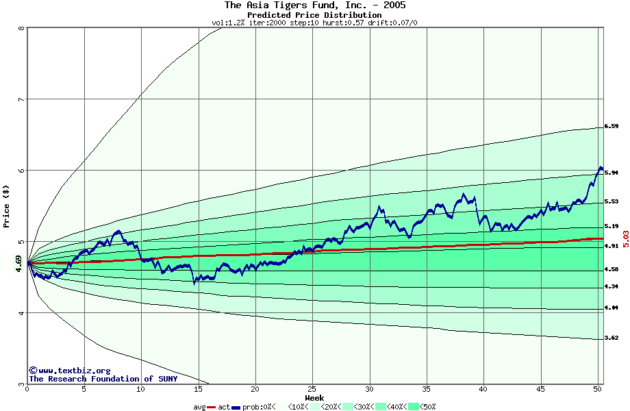 The following graph plots the year-to-date performance of the stock for 2005 compared to the probability calculated by a random walk model.
