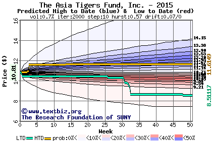 The high to date and low to date prices of the stock plotted against a random walk model for 2015 (what's this?).