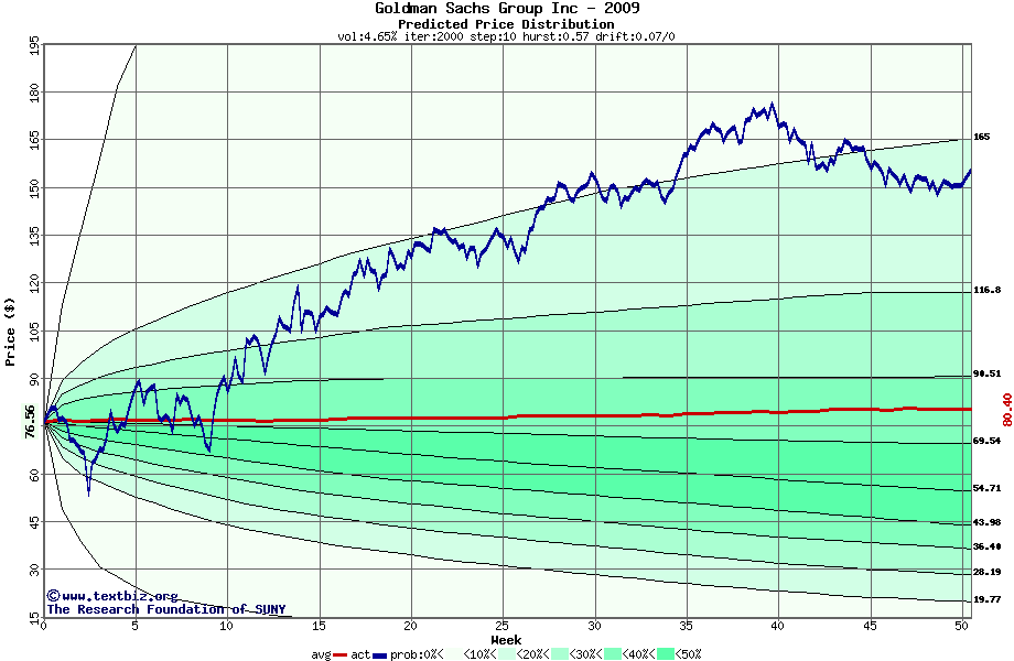 The following graph plots the year-to-date performance of the stock for 2009 compared to the probability calculated by a random walk model.