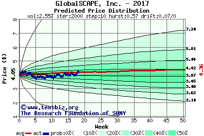 The high to date and low to date prices of the stock plotted against a random walk model for 2017 (what's this?).