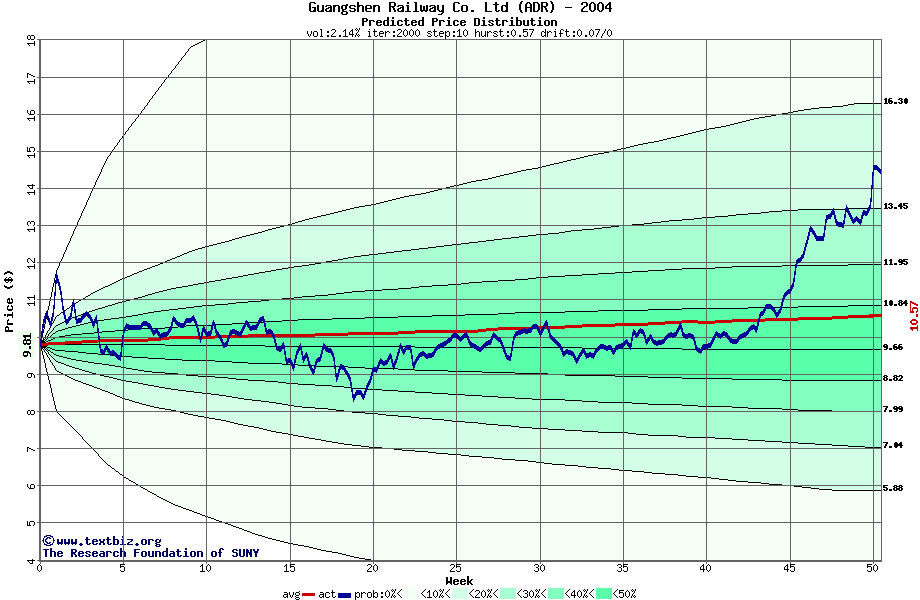 The following graph plots the year-to-date performance of the stock for 2004 compared to the probability calculated by a random walk model.