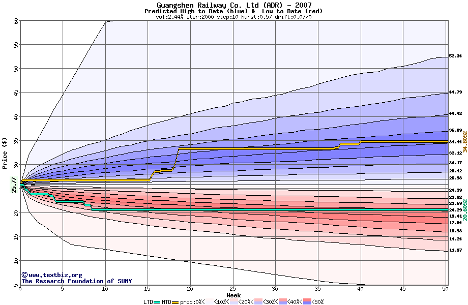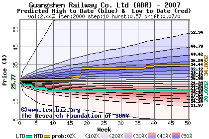 The high to date and low to date prices of the stock plotted against a random walk model for 2007 (what's this?).