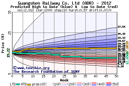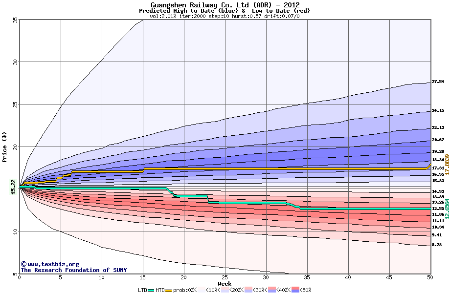 The high to date and low to date prices of the stock plotted against a random walk model for 2012 (what's this?).