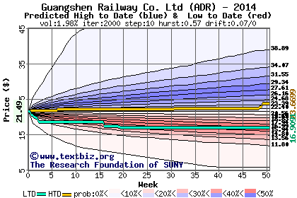The high to date and low to date prices of the stock plotted against a random walk model for 2014 (what's this?).