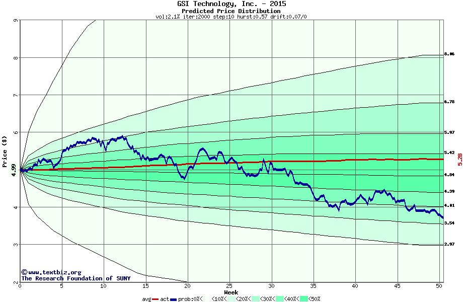 The following graph plots the year-to-date performance of the stock for 2015 compared to the probability calculated by a random walk model.