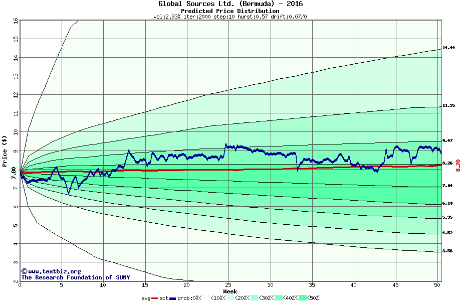 The high to date and low to date prices of the stock plotted against a random walk model for 2016 (what's this?).