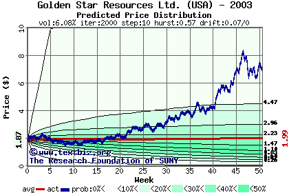 The high to date and low to date prices of the stock plotted against a random walk model for 2003 (what's this?).