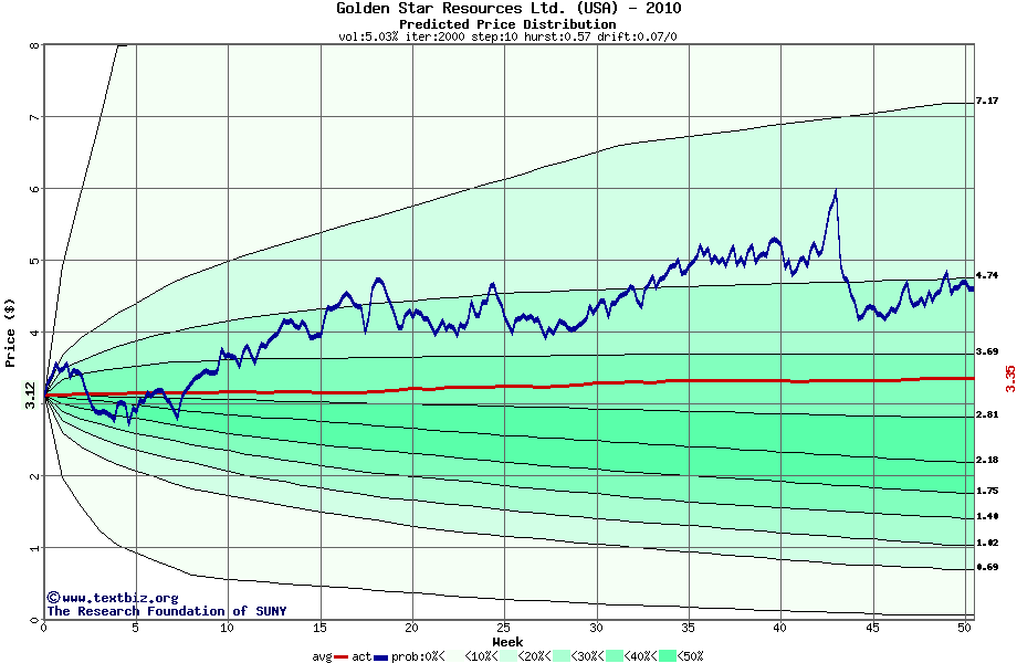 The following graph plots the year-to-date performance of the stock for 2010 compared to the probability calculated by a random walk model.
