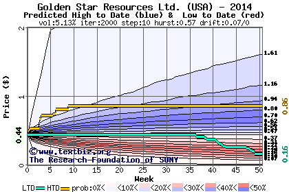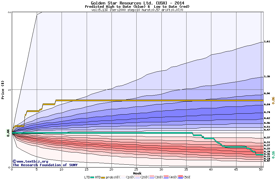 The high to date and low to date prices of the stock plotted against a random walk model for 2014 (what's this?).