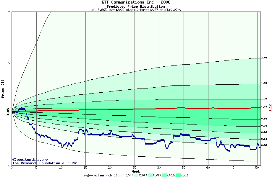 The high to date and low to date prices of the stock plotted against a random walk model for 2008 (what's this?).