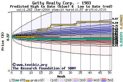 The high to date and low to date prices of the stock plotted against a random walk model for 1983 (what's this?).