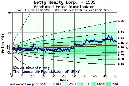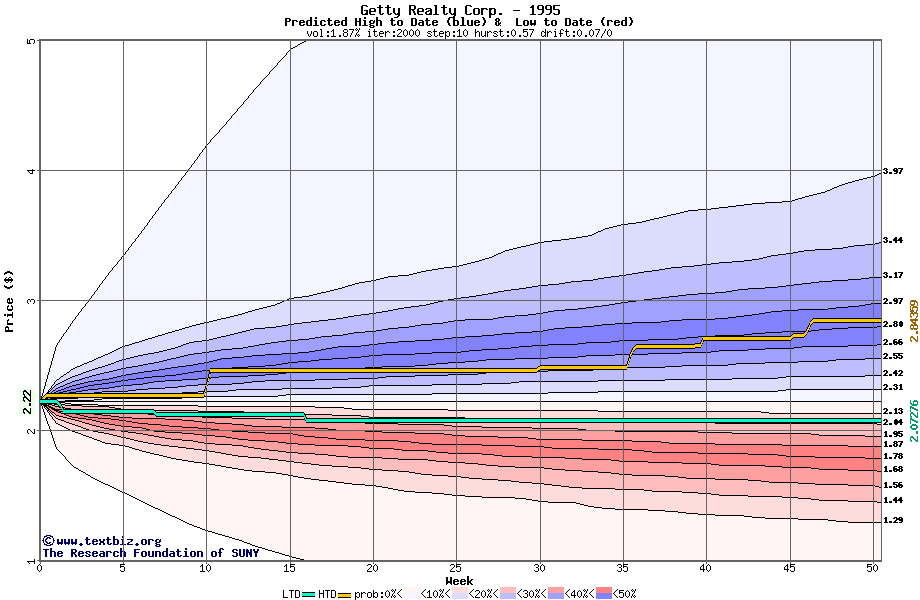 The high to date and low to date prices of the stock plotted against a random walk model for 1995 (what's this?).