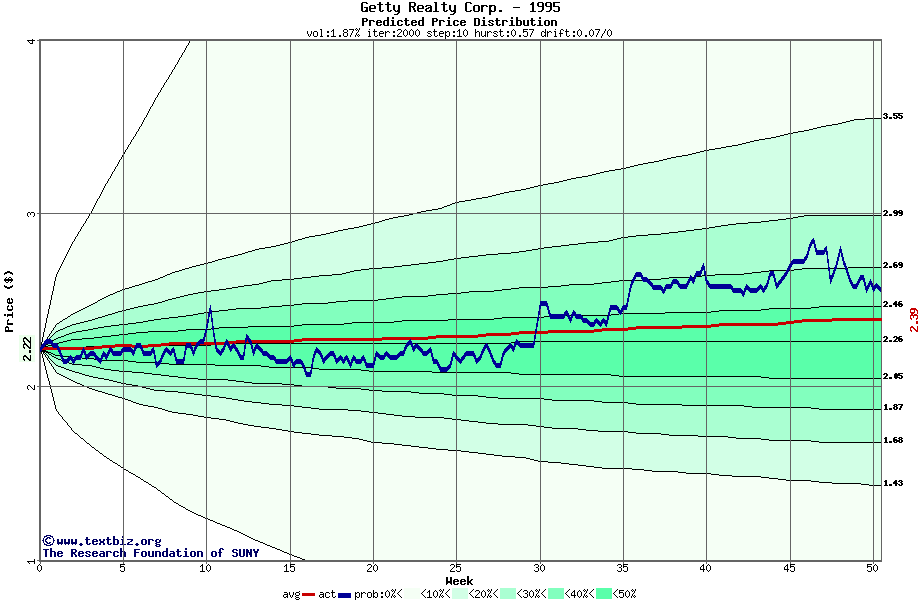 The following graph plots the year-to-date performance of the stock for 1995 compared to the probability calculated by a random walk model.