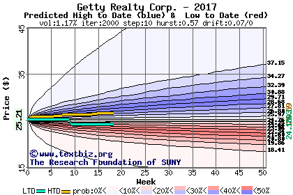 The high to date and low to date prices of the stock plotted against a random walk model for 2017 (what's this?).