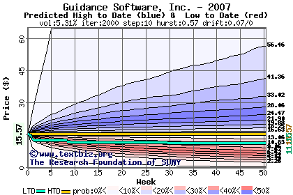 The high to date and low to date prices of the stock plotted against a random walk model for 2007 (what's this?).