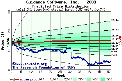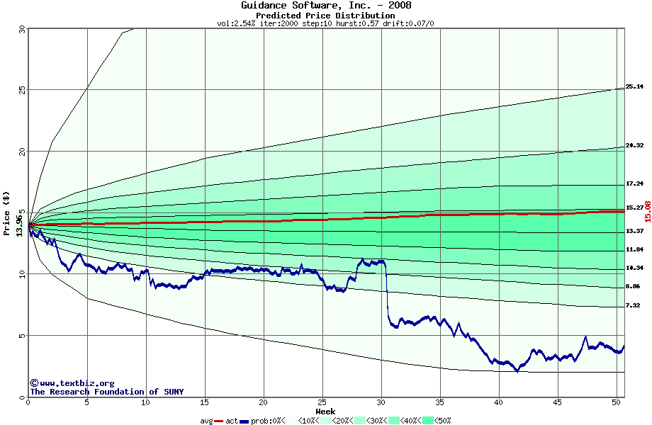 The following graph plots the year-to-date performance of the stock for 2008 compared to the probability calculated by a random walk model.