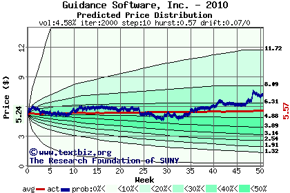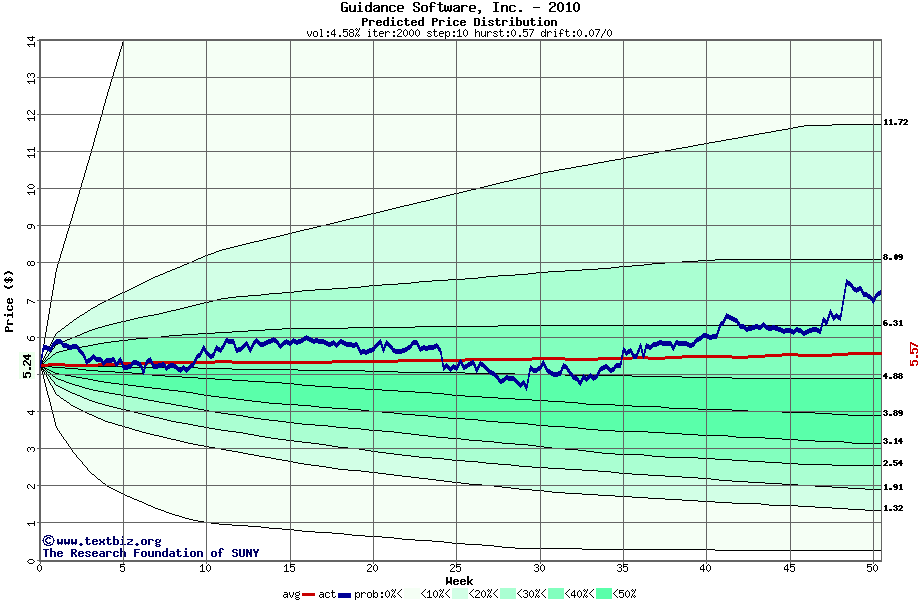 The following graph plots the year-to-date performance of the stock for 2010 compared to the probability calculated by a random walk model.