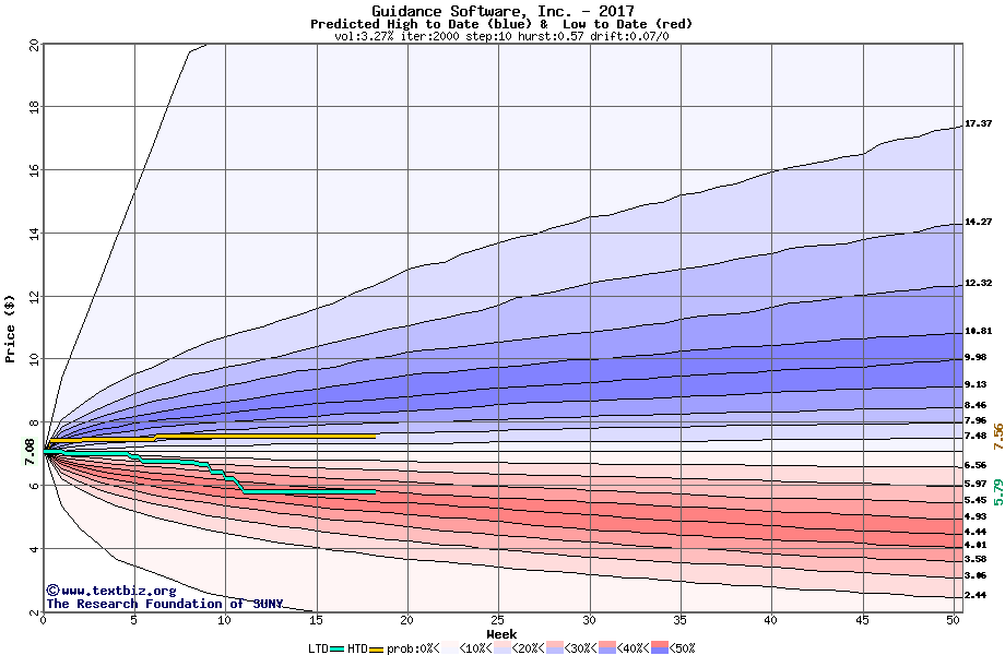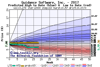 The high to date and low to date prices of the stock plotted against a random walk model for 2017 (what's this?).