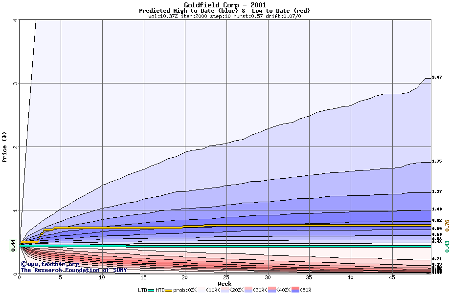 The high to date and low to date prices of the stock plotted against a random walk model for 2001 (what's this?).