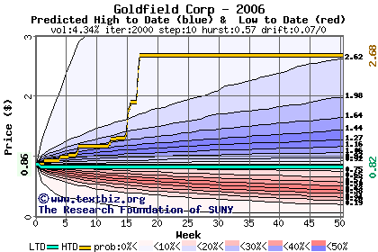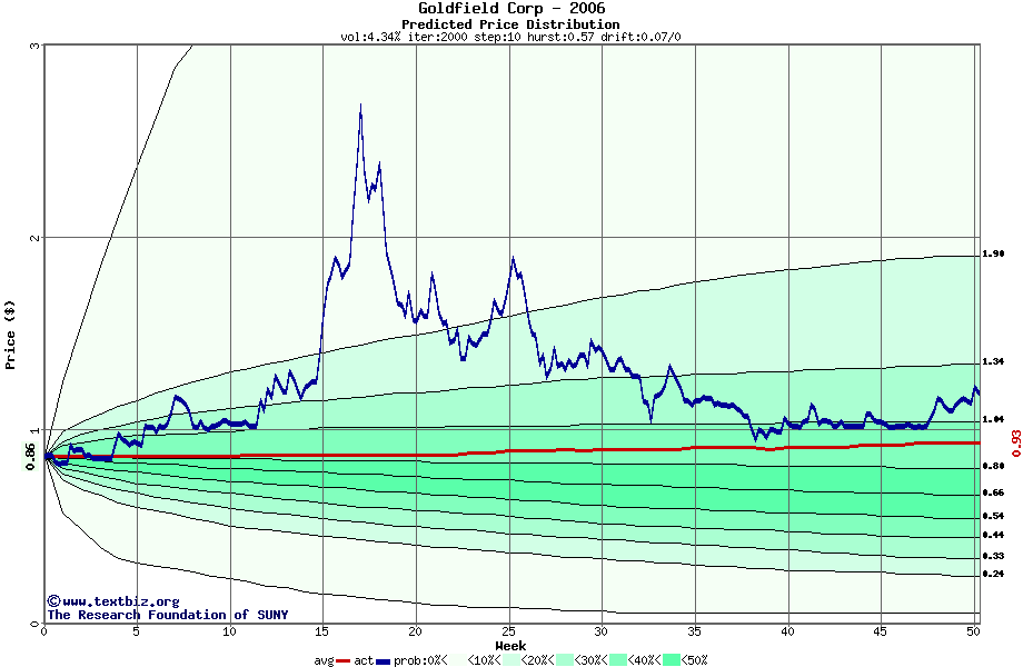 The high to date and low to date prices of the stock plotted against a random walk model for 2006 (what's this?).