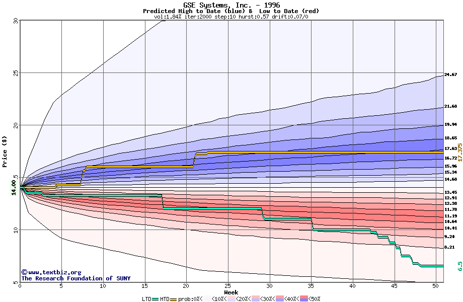 The high to date and low to date prices of the stock plotted against a random walk model for 1996 (what's this?).
