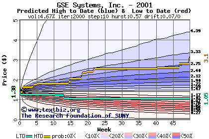 The high to date and low to date prices of the stock plotted against a random walk model for 2001 (what's this?).
