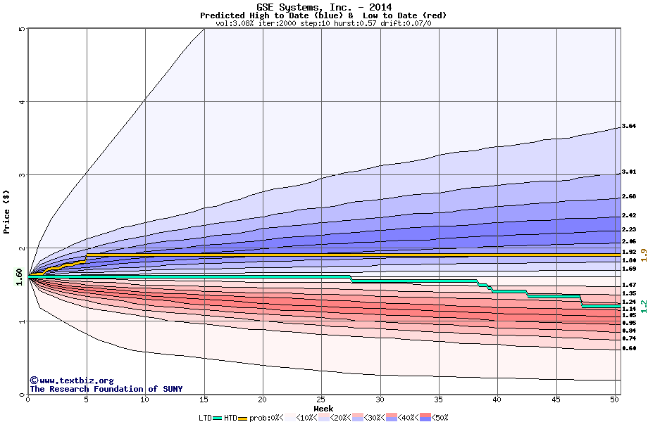 The high to date and low to date prices of the stock plotted against a random walk model for 2014 (what's this?).