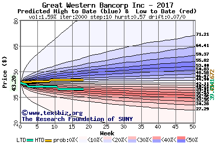 The high to date and low to date prices of the stock plotted against a random walk model for 2017 (what's this?).