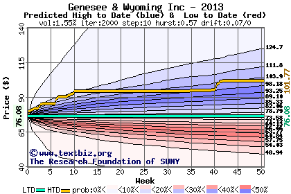 The high to date and low to date prices of the stock plotted against a random walk model for 2013 (what's this?).