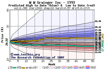 The high to date and low to date prices of the stock plotted against a random walk model for 1993 (what's this?).