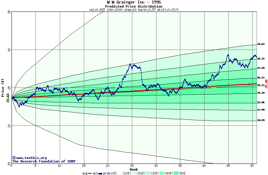 The following graph plots the year-to-date performance of the stock for 1996 compared to the probability calculated by a random walk model.