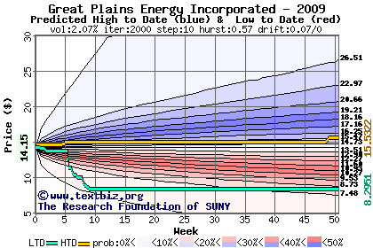 The high to date and low to date prices of the stock plotted against a random walk model for 2009 (what's this?).