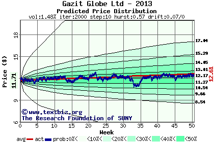 The high to date and low to date prices of the stock plotted against a random walk model for 2013 (what's this?).