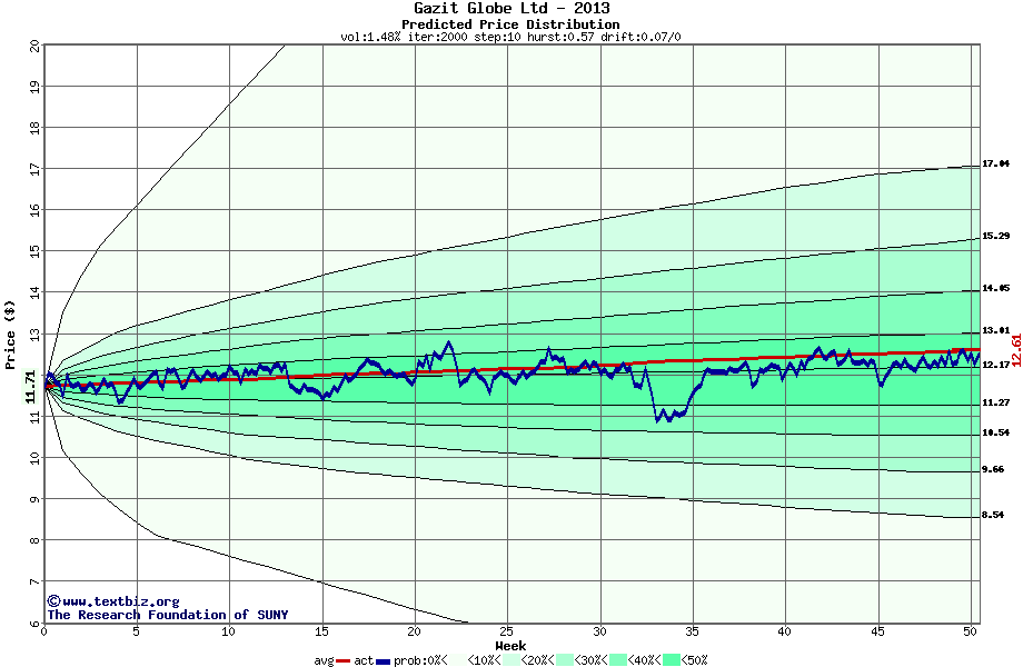 The following graph plots the year-to-date performance of the stock for 2013 compared to the probability calculated by a random walk model.
